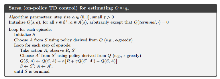 式子中涉及的参数$(s_t,a_t,R_{t+1},s_{t+1},a_{t+1})$,故称此为Sarsa算法。