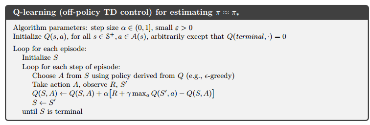 q(s_t,a_t)<–q(s_t,a_t)+\alpha[r_{t+1}+\gamma \max_aq(s_{t+1},a)-q(s_t,a_t)]